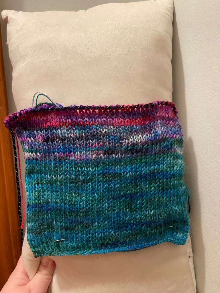 I had to improvise a bit while blocking since I lack both blocking mats and pins, so I’m making do with a small bolster pillow and some lace tatting needles. I’m using Expression Fiber Arts (of course) Mirage Sport in the Expressive Hues kit since I had two of the kits on hand and wouldn’t need to buy more yarn.